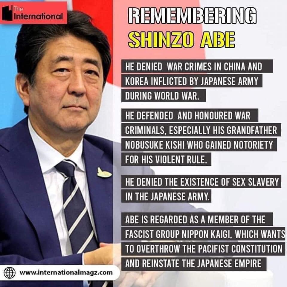 Martha Adriana Perez: Shinzo Abe was not only a denier of Japan’s war crimes but also an advocate of “containment of China.” In other words, a promoter of world instability and so an ally of USNATO’s war on China. Denying war crimes and desiring to repeat them seems to go hand in hand.