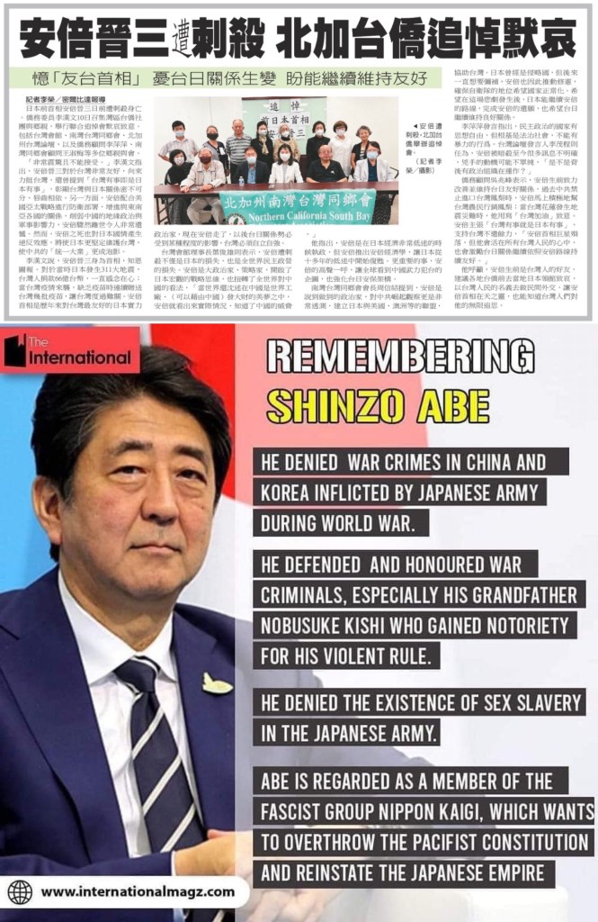 Northern California Chinese from Taiwan Province mourn the death of Abe despite his family’s war crimes during WWII. Posted byJohnsonwkchoiJuly 11, 2022Posted inUncategorized Northern California Chinese from Taiwan Province mourn the death of Abe despite his family’s war crimes during WWII. Share this: Click to share on X (Opens in new window) X Click to share on Facebook (Opens in new window) Facebook Like Loading...
