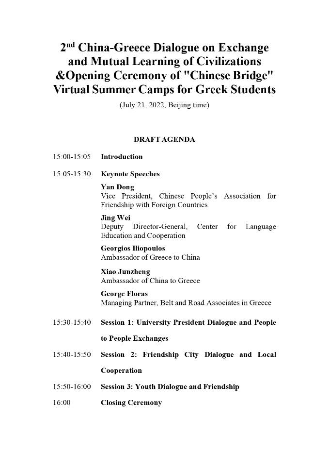 George Floras (Greece): It is my honor to participate as a keynote speaker on July the 21st, (14.30 Beijing time) at the 2nd China-Greece Dialogue on Exchange and Mutual Learning of Civilizations & Opening Ceremony of “Chinese Bridge” Virtual Summer Camps for Greek Students together with his Excellency the Ambassador of China to Greece Mr. Xiao Junzheng, his Excellency the Ambassador of Greece to China Mr Georgios Iliopoulos, the Vice President of Chinese People’s Association for Friendship with Foreign Countries Mr. Yan Dong and the Deputy Director-General Center for Language Education and Cooperation Mr. Jing Wei. If you wish to event through Zoom please let me know to send you the link. George Floras BELT AND ROAD ASSOCIATES GREECE