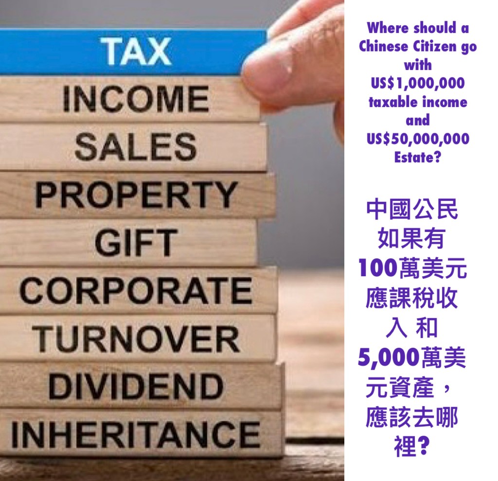 Where should a Chinese Citizen go with US$1,000,000 taxable income and US$50,000,000 Estate? 中國公民如果有 100萬美元應課稅收入 和 5,000萬美元資產,應該去哪裡?
