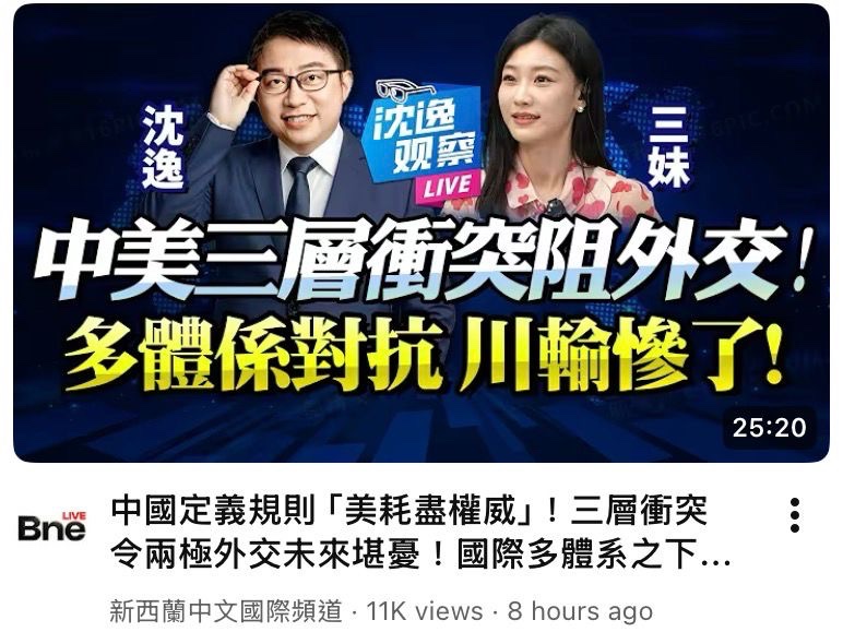 New Zealand TV Station video: China defines the rules, ‘the U.S. exhausts its authority’! Three layers of conflict spell a worrying future for bipolar diplomacy! Under a multi-system international order, the trend of China winning and the U.S. losing is set! The Taiwan Strait is no longer an issue!” 中國定義規則「美耗盡權威」!三層衝突令兩極外交未來堪憂!國際多體系之下,中贏美輸趨勢定!台海不再是問題! 回歸祖國可能在2027年發生!?