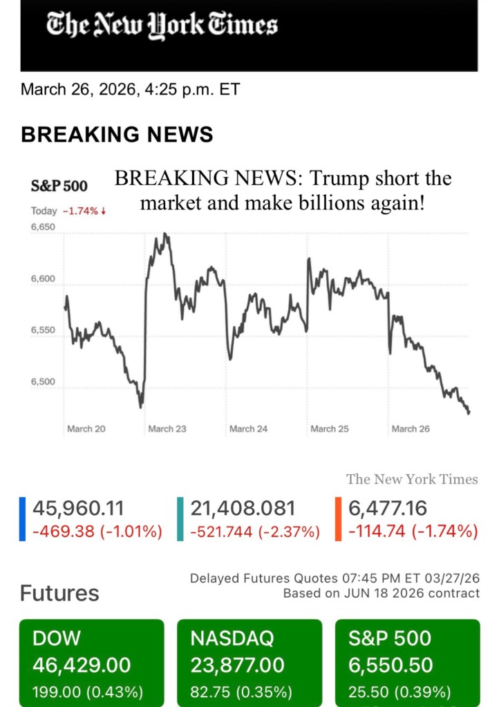 NYT BREAKING NEWS: Trump short the market and make billions again! U.S. Stocks Have Their Biggest Drop Since Start of Iran War. The S&P 500 tumbled 1.7%, falling as oil prices rose sharply after President Trump raised the pressure on Iran to accept terms to end the war. 紐約時報突發新聞:特朗普做空市場,再次賺進數十億!美國股市迎來自伊朗戰爭爆發以來最大跌幅. 標準普爾500指數下跌1.7%,由於總統特朗普加大對伊朗的施壓,要求其接受結束戰爭的條件,油價隨之大幅上漲。