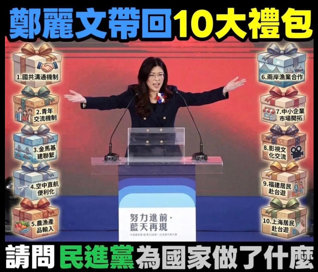 Cheng Li-wen brings back 10 major benefits, striving to move forward and restore the blue sky (referring to the KMT’s political prospects) 鄭麗文帶回10大禮包 努力進前藍天再現: