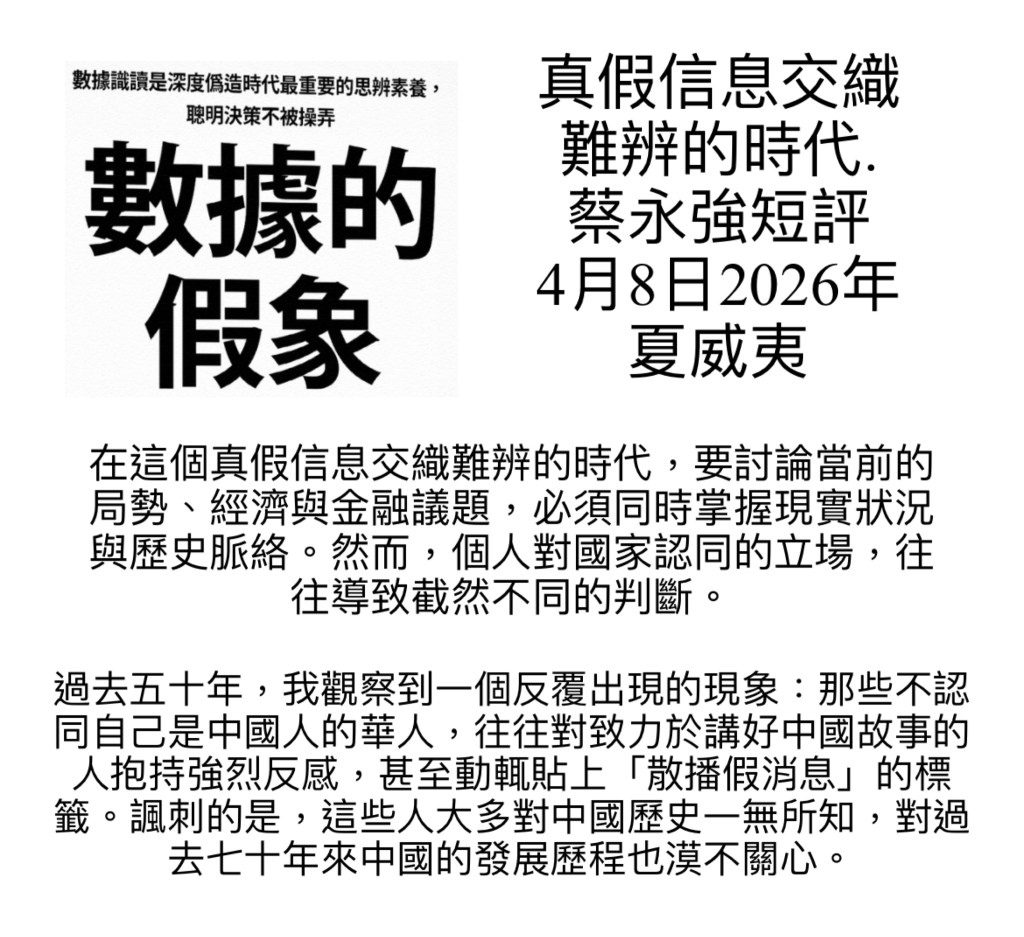 An Era Where Truth and Falsehood Intertwine Unrecognizably – Short Commentary by Johnson Choi, April 8, 2026, Hawaii 真假信息交織難辨的時代. 蔡永強短評 4月8日2026年 夏威夷