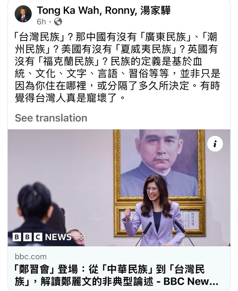 「台灣民族」?那中國有沒有「廣東民族」、「潮州民族」?美國有沒有「夏威夷民族」?英國有沒有「福克蘭民族」?民族的定義是基於血統、文化、文字、言語、習俗等等,並非只是因為你住在哪裡,或分隔了多久所決定。有時覺得台灣人真是寵壞了. “Taiwanese nation”? Is there a “Guangdong ethnic group” or “Chaozhou ethnic group” in China? Is there a “Hawaiian nation” in the US? Is there a “Falkland Nation” in the UK? Nation is defined based on bloodline, culture, writing, language, customs, etc., not just because of where you live or how long you have been separated. Sometimes I think Taiwanese are really spoiled.